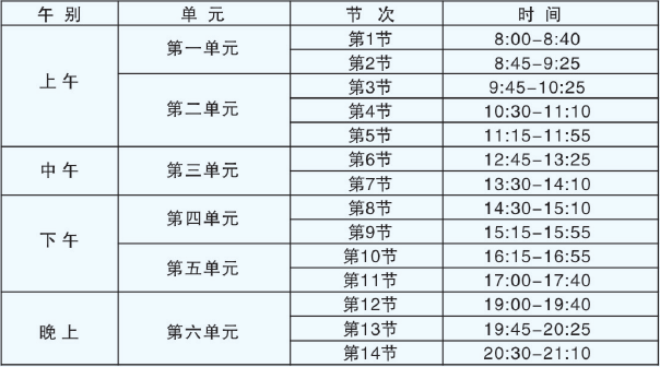 注:每周三第五单元(10-11节)为政治学习、业务学习和学生课外活动时间,原则上不安排其他课程。